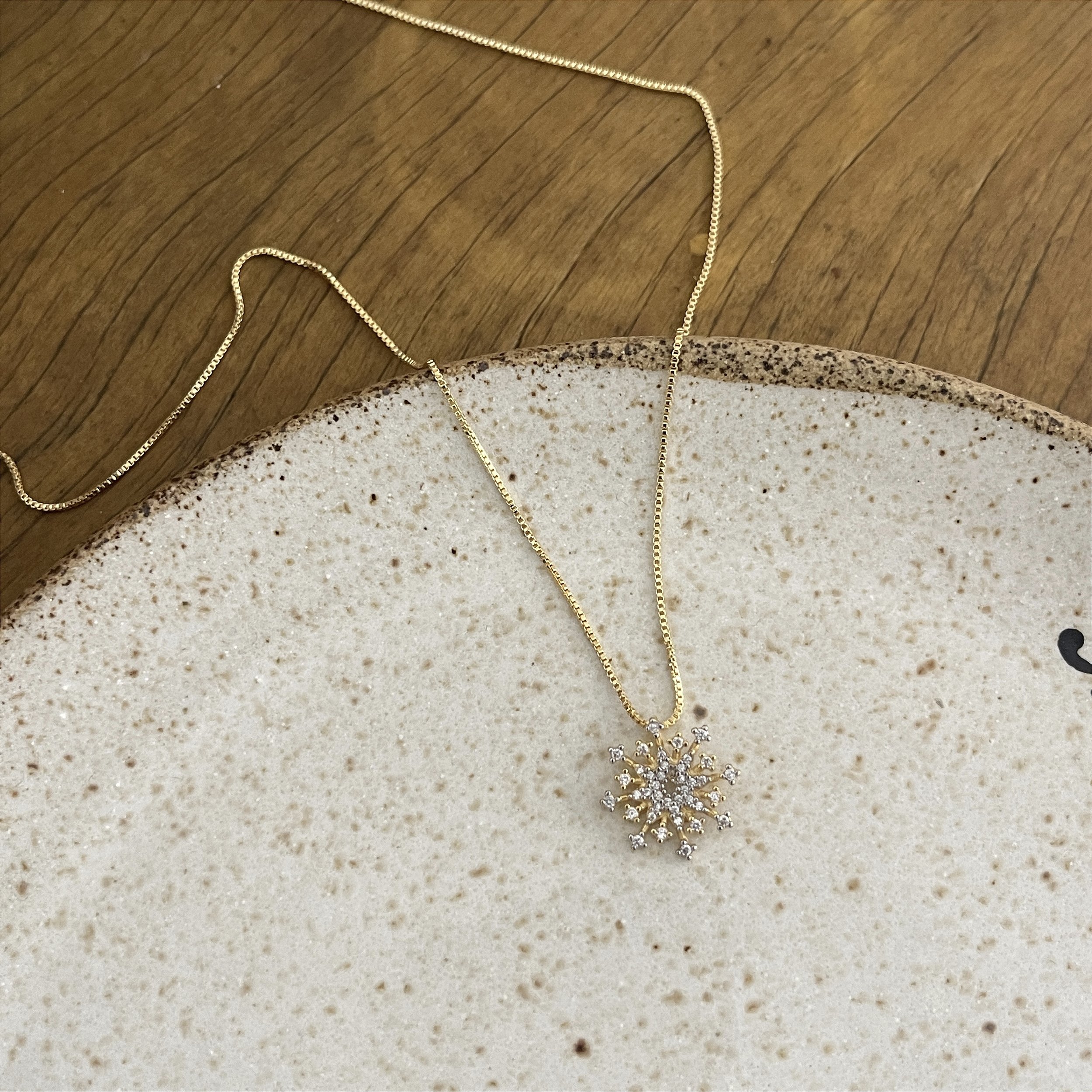 colar corrente veneziana, pingente com zircônias, lembra um sol, bicolor - semijoia