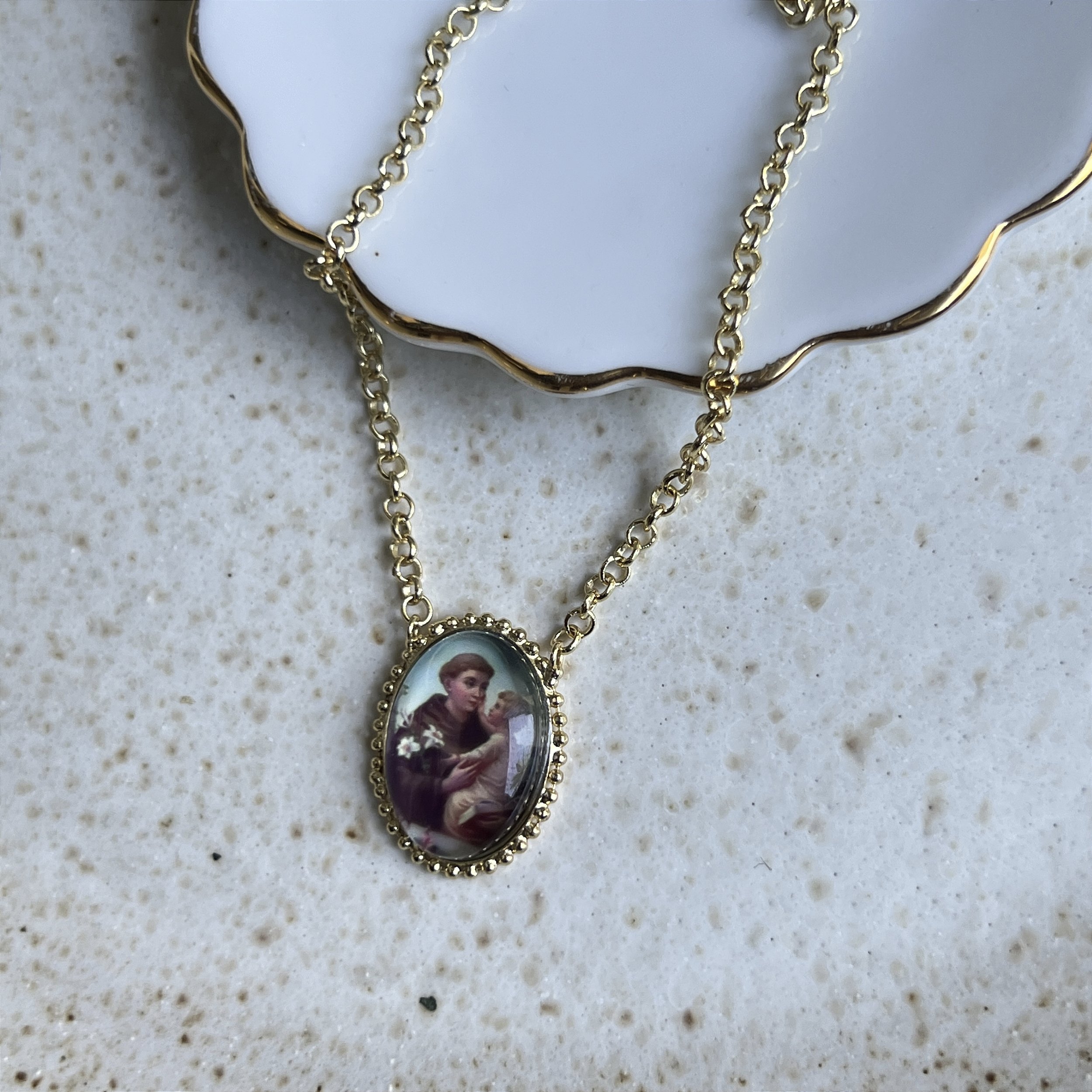 Colar delicado, mini elos portugueses, com imagem colorida de resina, Dourado - semijoia, Banho de Ouro 18k
