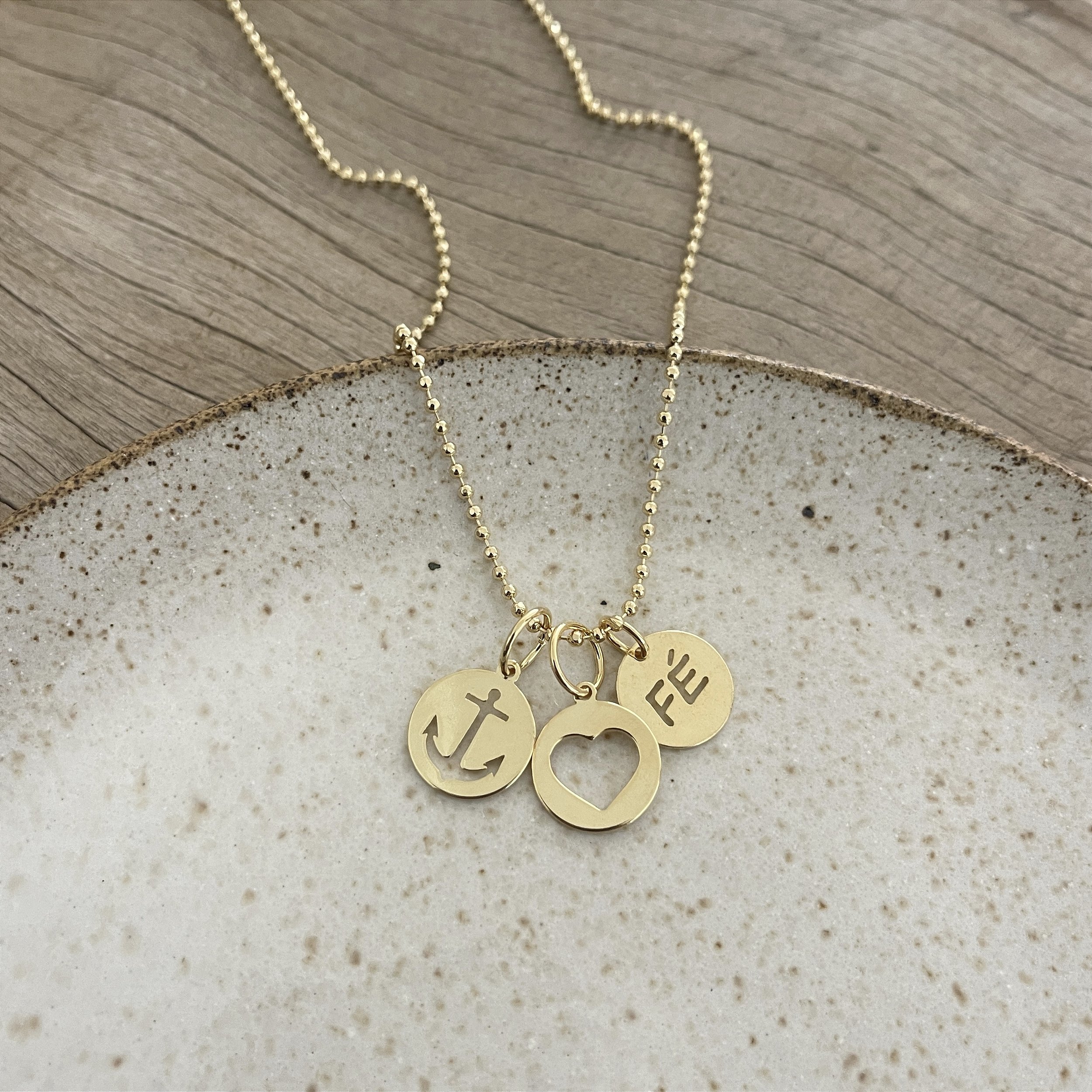 colar corrente de bolinhas com três pingentes: fé, coração e âncora da esperança, dourado - semijoia