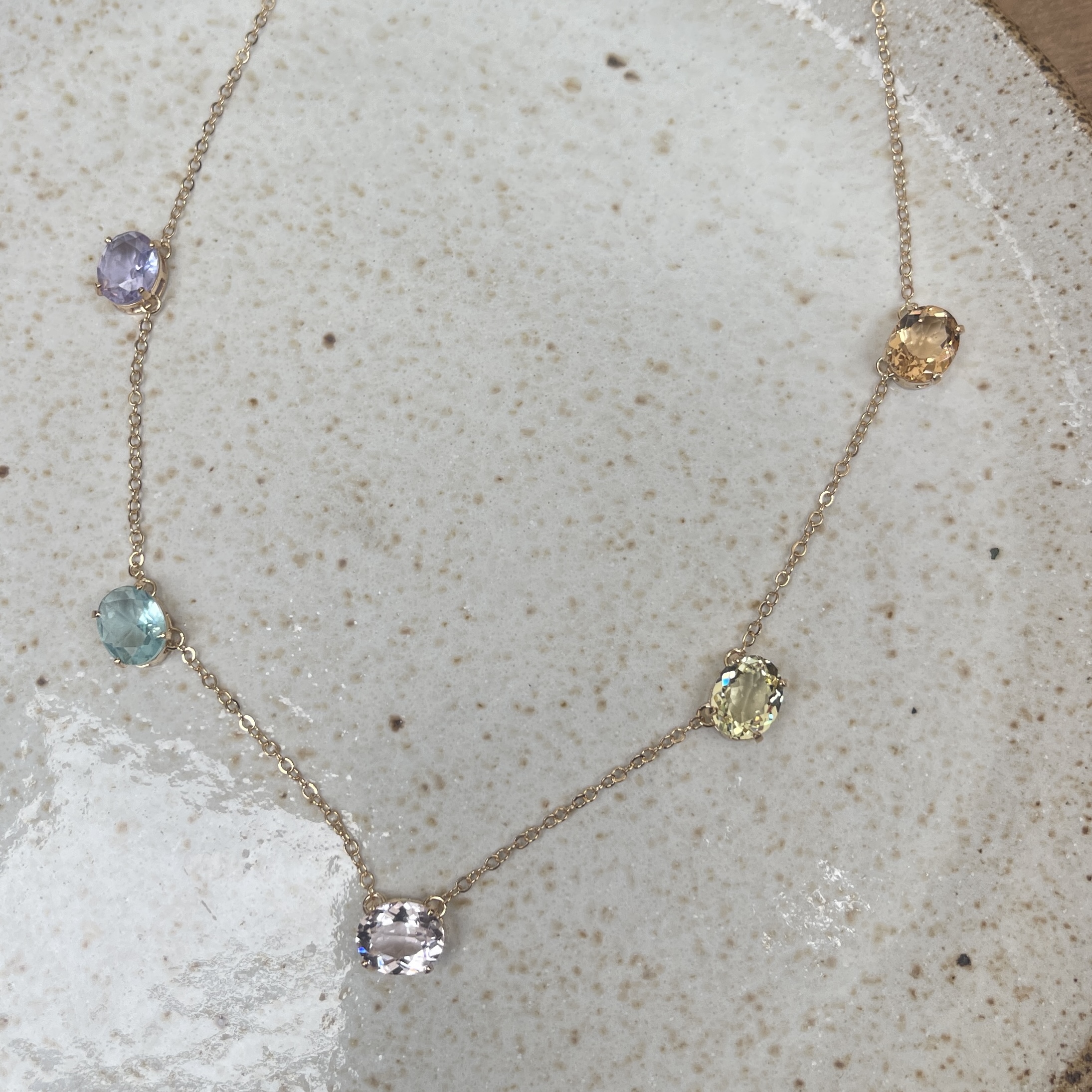 Colar com cinco pingentes fixos, Tanzanita, Aqua, Kunzita, Citrino Limão, Morganita, semijoia