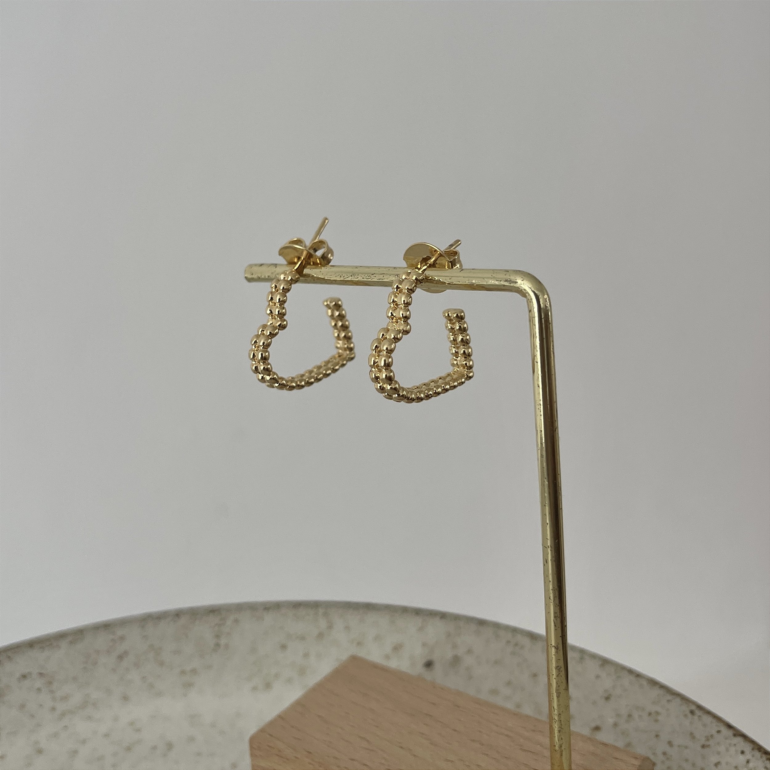 Brinco meia argola em formato de coração composto por mini esferas que dão um acabamento rendado a peça, dourado - semijoia