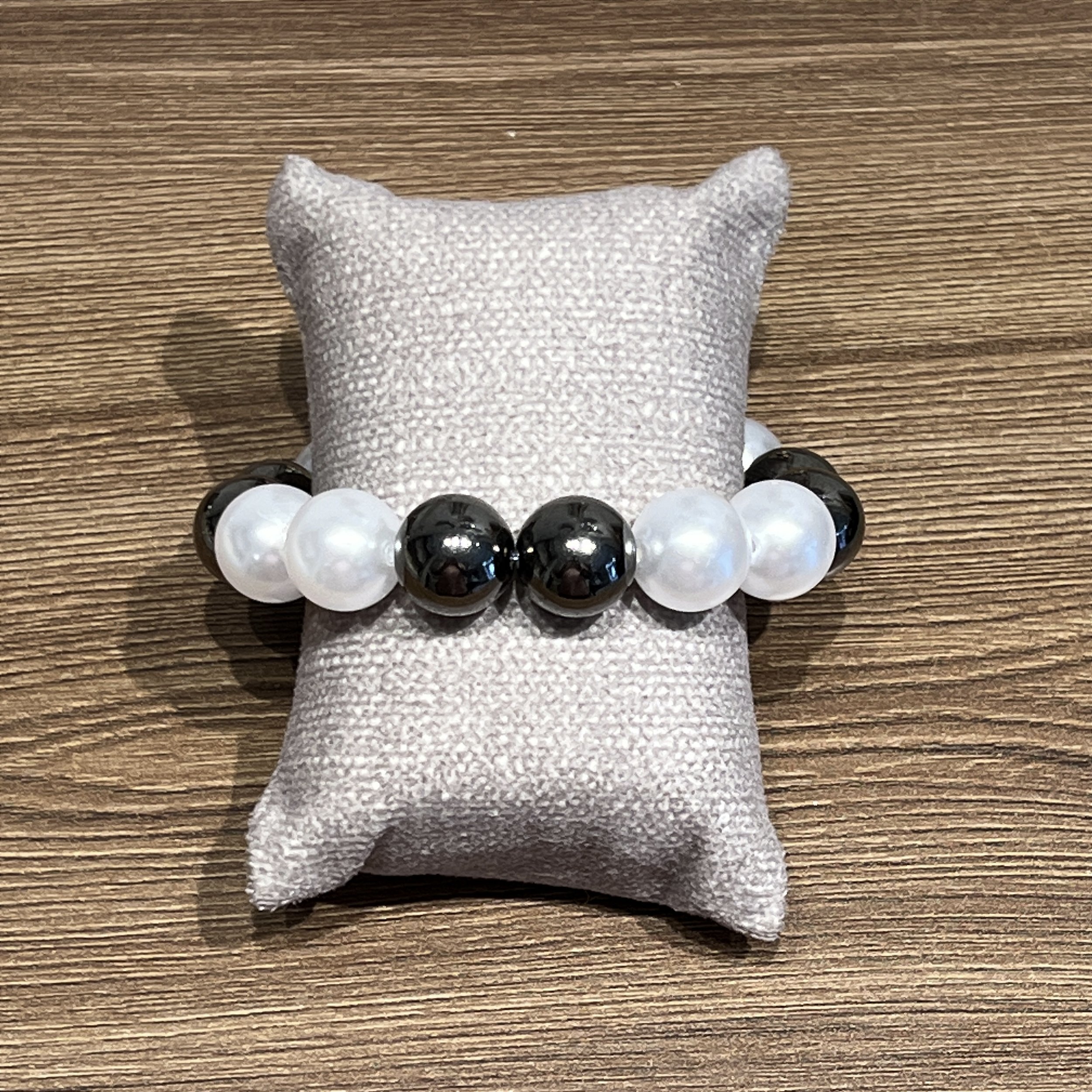 Pulseira de Bolas, com elástico, perolas brancas e grafite - bijuteria